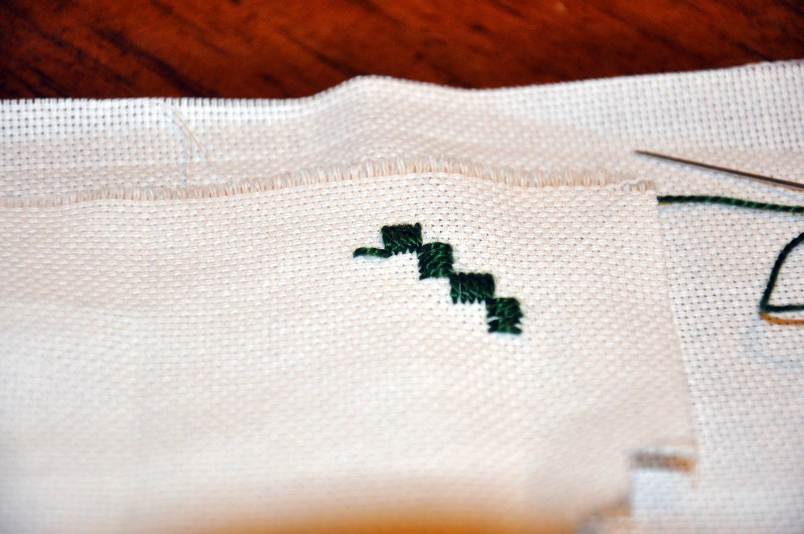 Back to the sewing: So after this block, you'll be turning your work to go up again and make another kloster block where the stitches within it run horizontal (like the first one we did). From where your thread is on the back, count up 4 threads and run it through that hole again. Yes, another thread is already running through there. Are you starting to see a pattern when turning? If not yet, well, you will. From where you just came up on the front, count 4 threads to the inside and go back down. On the back, count out 4 and up one and repeat until you have....that's right, 5 stitches. You're totally getting it! My tail has finally been about completely captured. Looking back, I probably should have trimmed it pretty short on the third or fourth stitch of that block rather than leave it poking out of the top, but hindsight is 20-20, right?